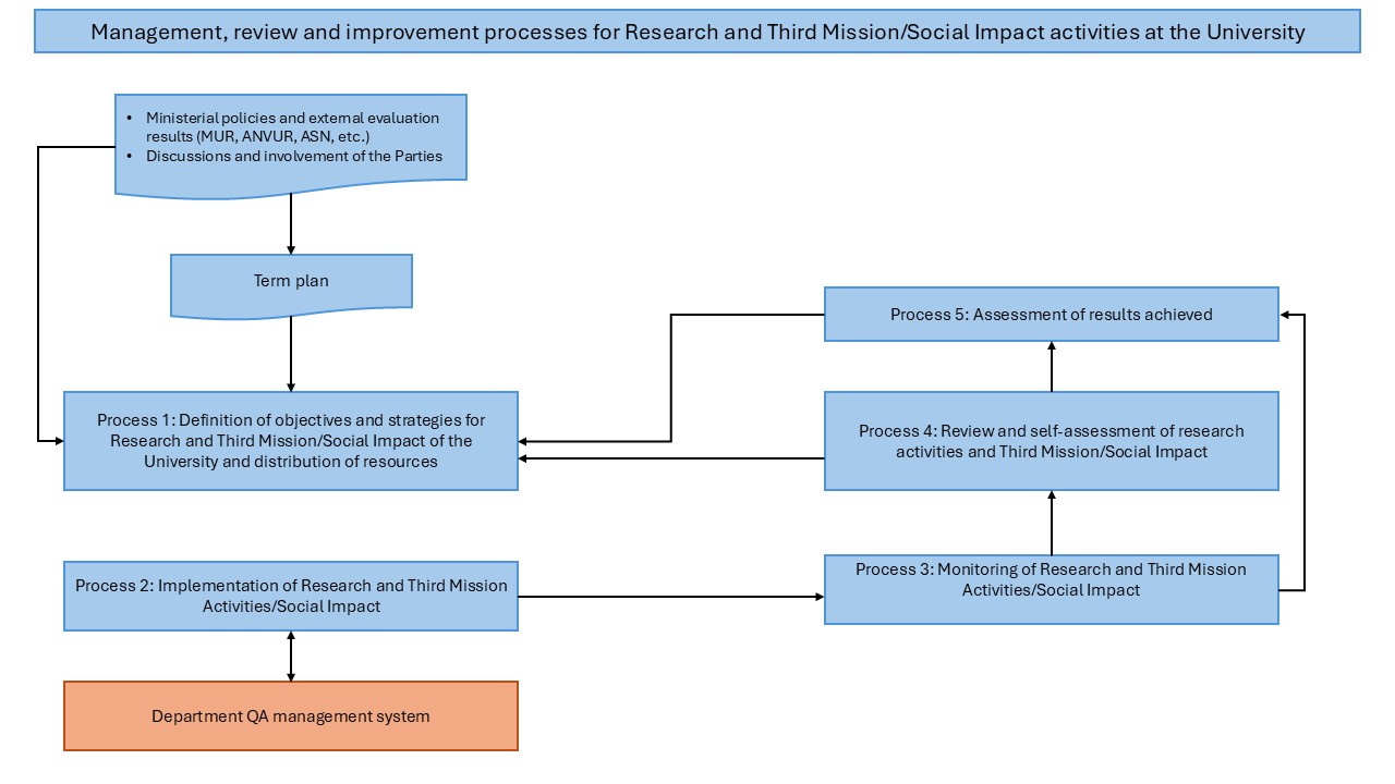 The Process of Management, Review and Improvement of the University's research and third mission activities is schematized in the attached image.