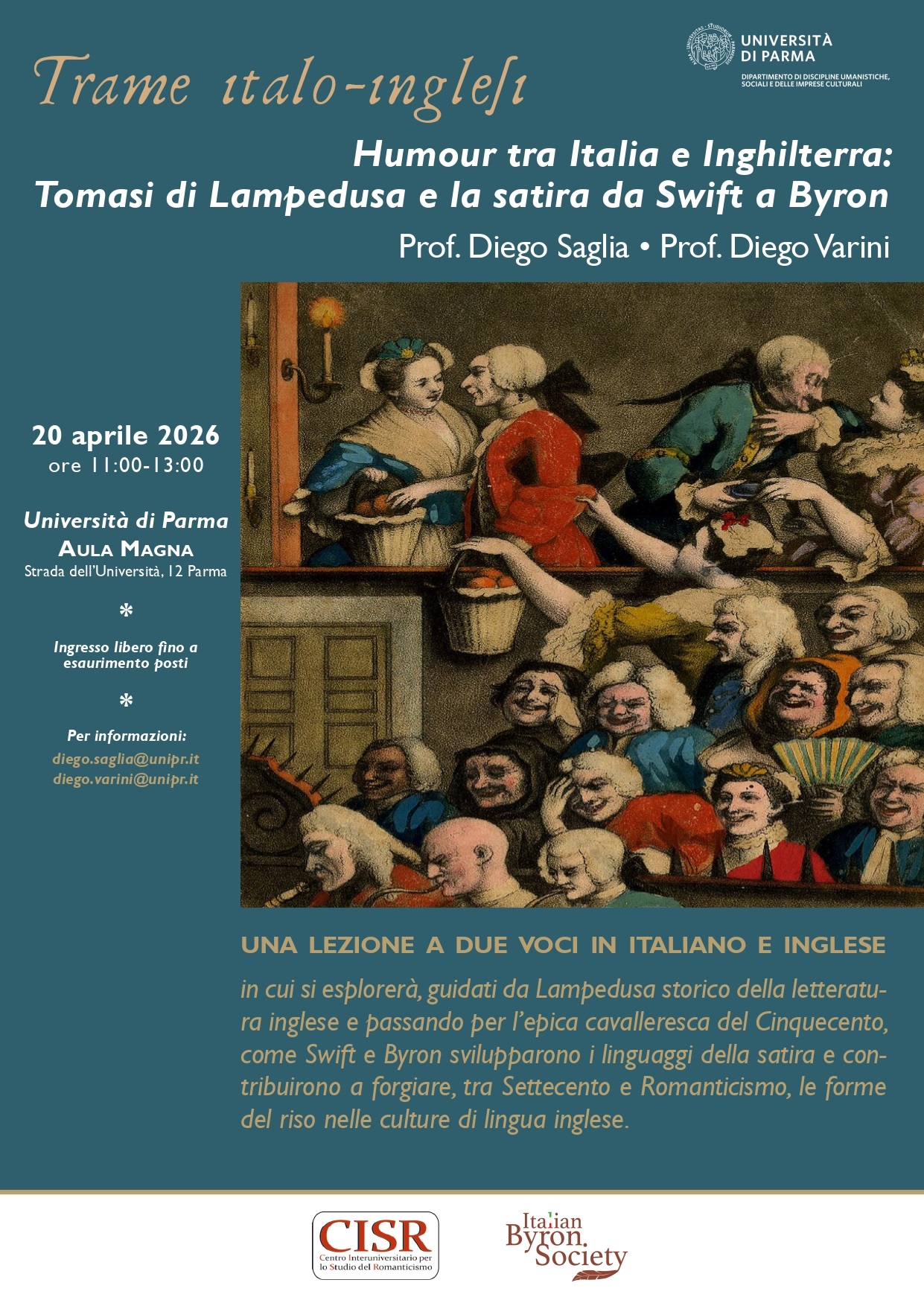 Humour tra Italia e Inghilterra: Tomasi di Lampedusa e la satira da Swift a Byron il titolo dell’appuntamento, nel quale i docenti del Dipartimento di Discipline Umanistiche, Sociali e delle Imprese Culturali (DUSIC) Diego Saglia e Diego Varini guideranno il pubblico in un percorso critico attraverso alcune delle voci più significative della tradizione letteraria europea. L’iniziativa si propone di mettere in luce affinità, differenze e influenze reciproche fra il contesto italiano e quello britannico, soffermandosi in particolare sul ruolo dell’ironia e della satira come strumenti di analisi sociale e culturale.