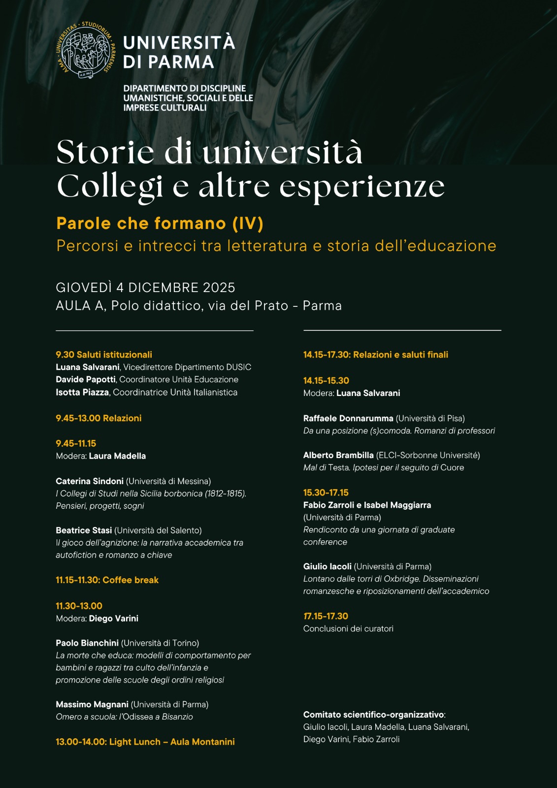 A seguire le diverse sessioni. Nella prima, moderata da Laura Madella dell’Università di Parma, interverranno Caterina Sindoni dell’Università di Messina (I Collegi di Studi nella Sicilia borbonica 1912-1815. Pensieri, progetti, sogni) e Beatrice Stasi dell’Università del Salento (Il gioco dell’agnizione: la narrativa accademica tra autofiction e romanzo a chiave). Nella seconda, moderata da Diego Varini dell’Università di Parma, interverranno Paolo Bianchini dell’Università di Torino (La morte che educa: modelli di comportamento per bambini e ragazzi tra culto dell’infanzia e promozione delle scuole degli ordini religiosi) e Massimo Magnani dell’Università di Parma (Omero a scuola: l’Odissea a Bisanzio). Nel pomeriggio, dalle 14.15, la terza e ultima sessione, moderata da Luana Salvarani dell’Università di Parma, con Raffaele Donnarumma dell’Università di Pisa (Da una posizione (s)comoda. Romanzi di professori), Alberto Brambilla di ELCI – Sorbonne Université (Mal di testa. Ipotesi per il seguito di Cuore), Fabio Zarroli e Isabel Maggiarra dell’Università di Parma (Rendiconto da una giornata di graduate conference) e Giulio Iacoli dell’Università di Parma (Lontano dalle torri di Oxbridge. Disseminazioni romanzesche e riposizionamenti dell’accademico).