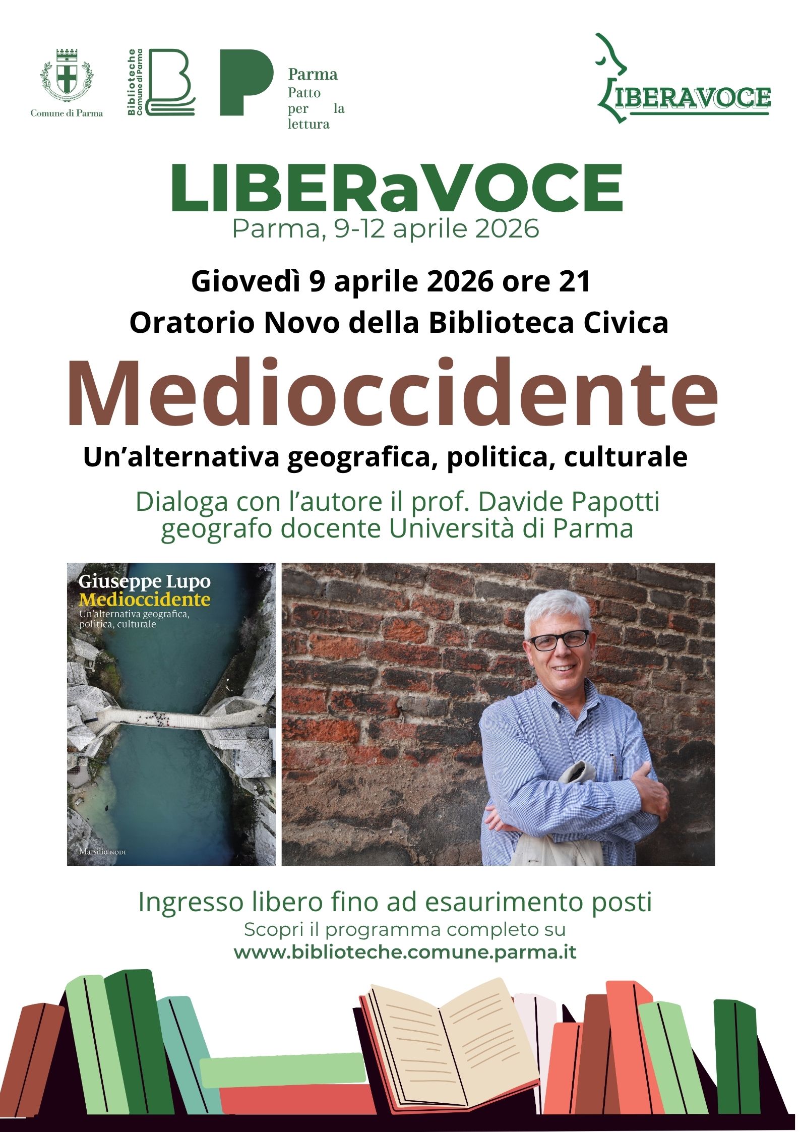 Parma, 8 aprile 2026 - Nell'ambito della quinta edizione della rassegna "LIBERaVOCE" promossa dalle Biblioteche del Comune di Parma, giovedì 9 aprile alle ore 21, presso l'Oratorio Novo della Biblioteca Civica (Vicolo Santa Maria, 5), Giuseppe Lupo presenterà il suo libro Medioccidente. Un’alternativa geografica, politica, culturale (Marsilio, 2026) in dialogo con il geografo Davide Papotti, docente dell’Università di Parma.