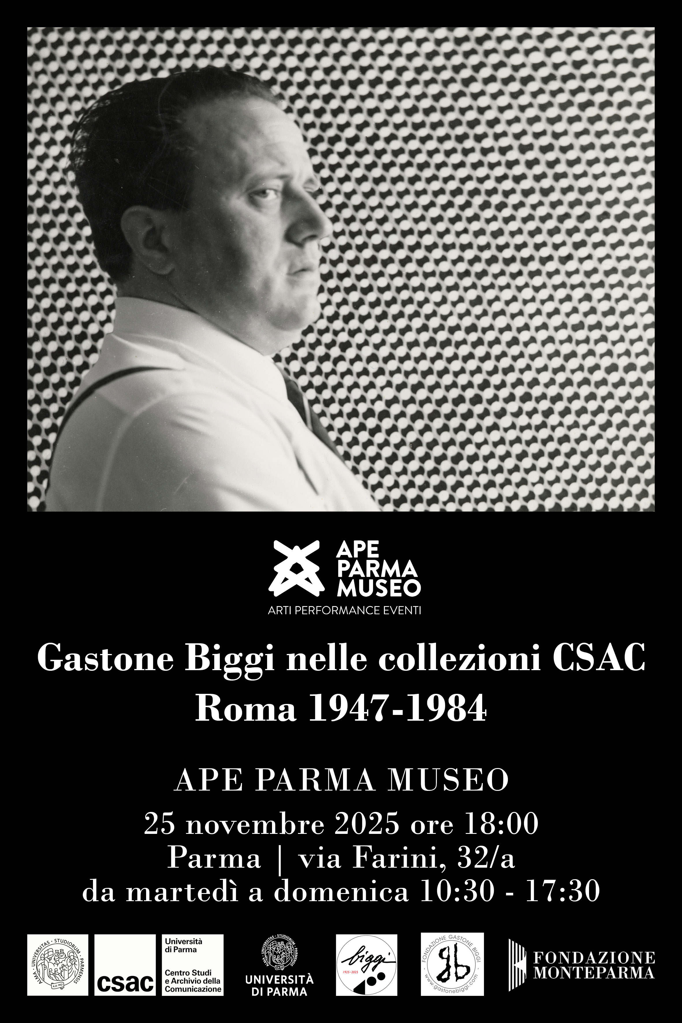 Parma, 19 novembre 2025 – Il Centro Studi e Archivio della Comunicazione - CSAC dell’Università di Parma presenta, all’APE Museo di Parma, la mostra Gastone Biggi nelle collezioni CSAC. Roma 1947–1984, che sarà inaugurata martedì 25 novembre alle 18 e visitabile fino al 1° febbraio 2026